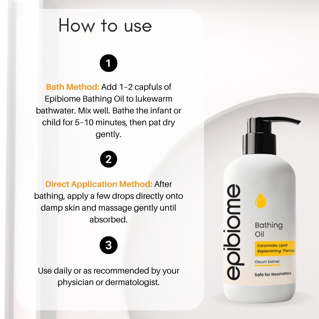 1. Bath Method: Add 1–2 capfuls of Epibiome Bathing Oil to lukewarm bathwater. Mix well. Bathe the infant or child for 5–10 minutes, then pat dry gently.
