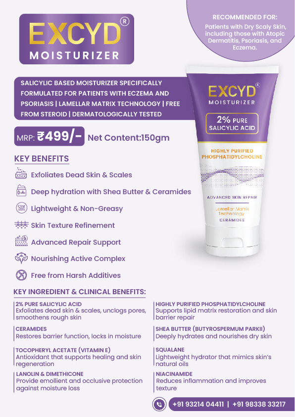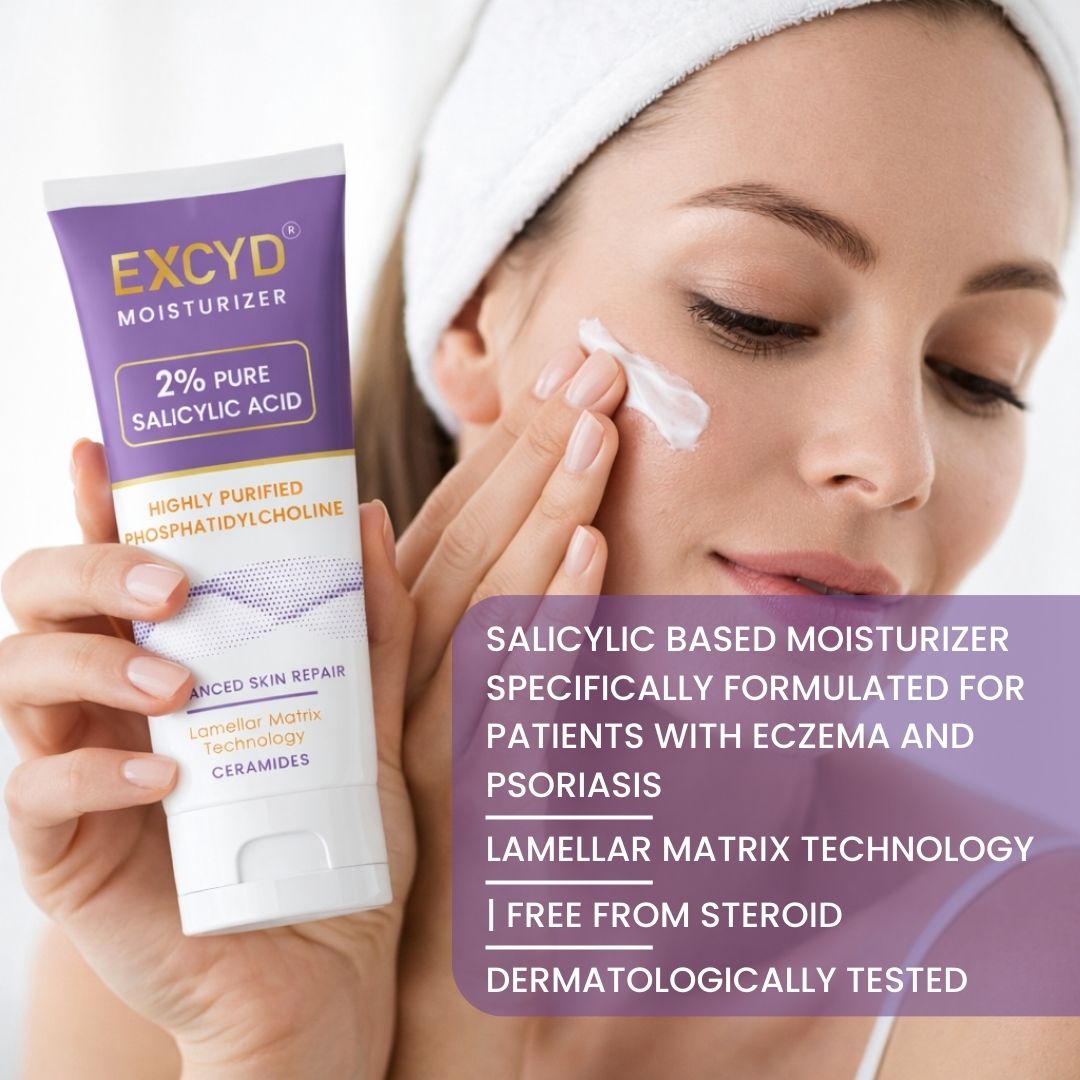 EXCYD® Moisturizer is a salicylic-based moisturizer formulated for patients with dry, scaly skin including eczema, psoriasis, and atopic dermatitis. Powered by 2% Pure Salicylic Acid, Lamellar Matrix Technology, ceramides, and nourishing emollients, it exfoliates dead skin and scales while providing deep hydration and advanced skin repair support. Dermatologically tested and free from steroids.