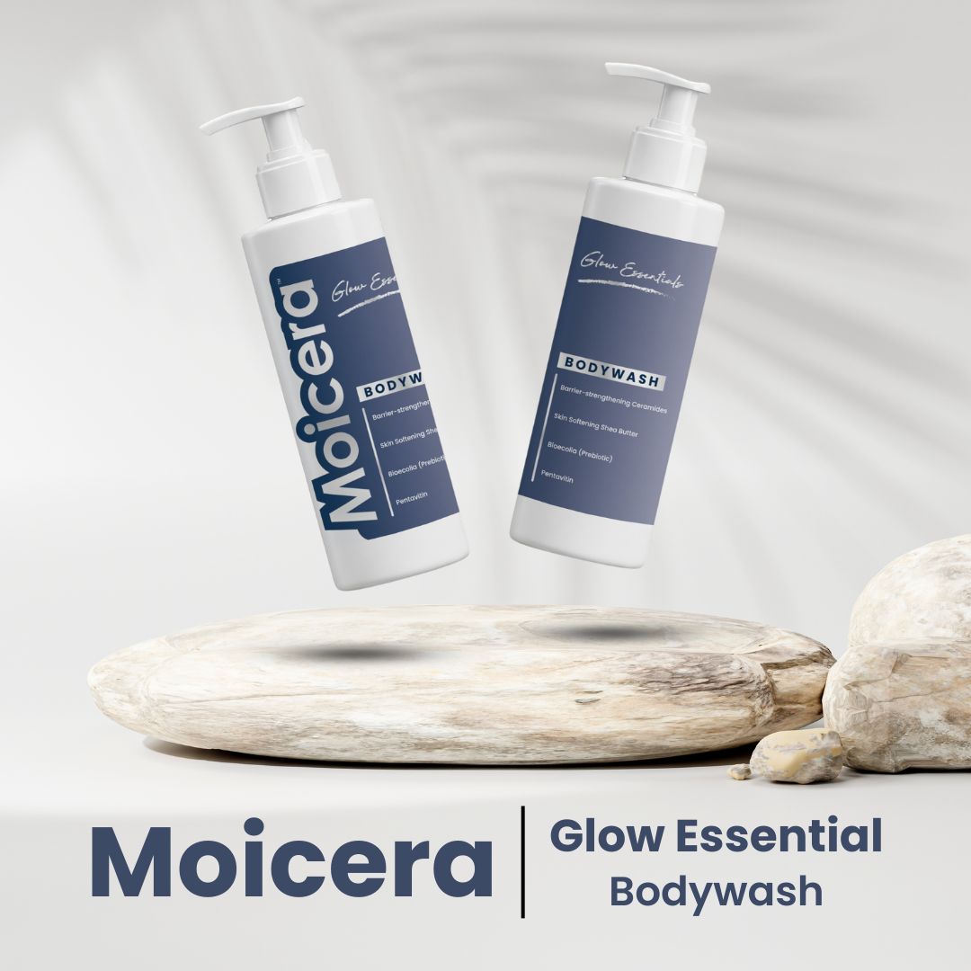 Moicera Glow Essentials Body Wash is a barrier-strengthening cleansing formula enriched with Ceramides, Shea Butter, Bioecolia (Prebiotic), and Pentavitin to support skin hydration and softness.